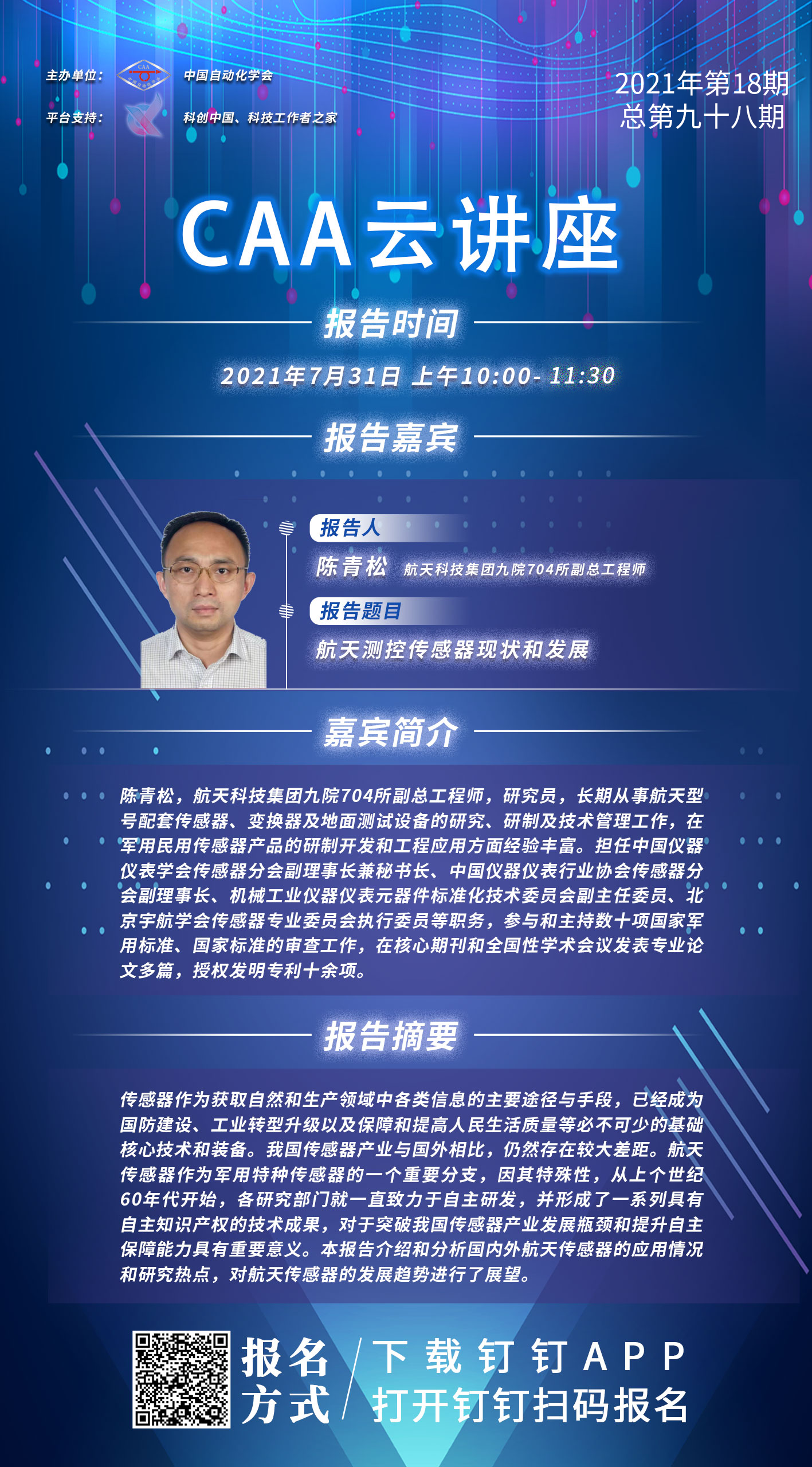 2021年中國(guó)自動(dòng)化學(xué)會(huì)第十八期云講座將于7月31日10:00-11:30開講,本期云講座邀請(qǐng)到航天科技集團(tuán)九院704所副總工程師陳青松,為大家?guī)韴?bào)告:航天測(cè)控傳感器現(xiàn)狀和發(fā)展。精彩內(nèi)容,敬請(qǐng)期待!