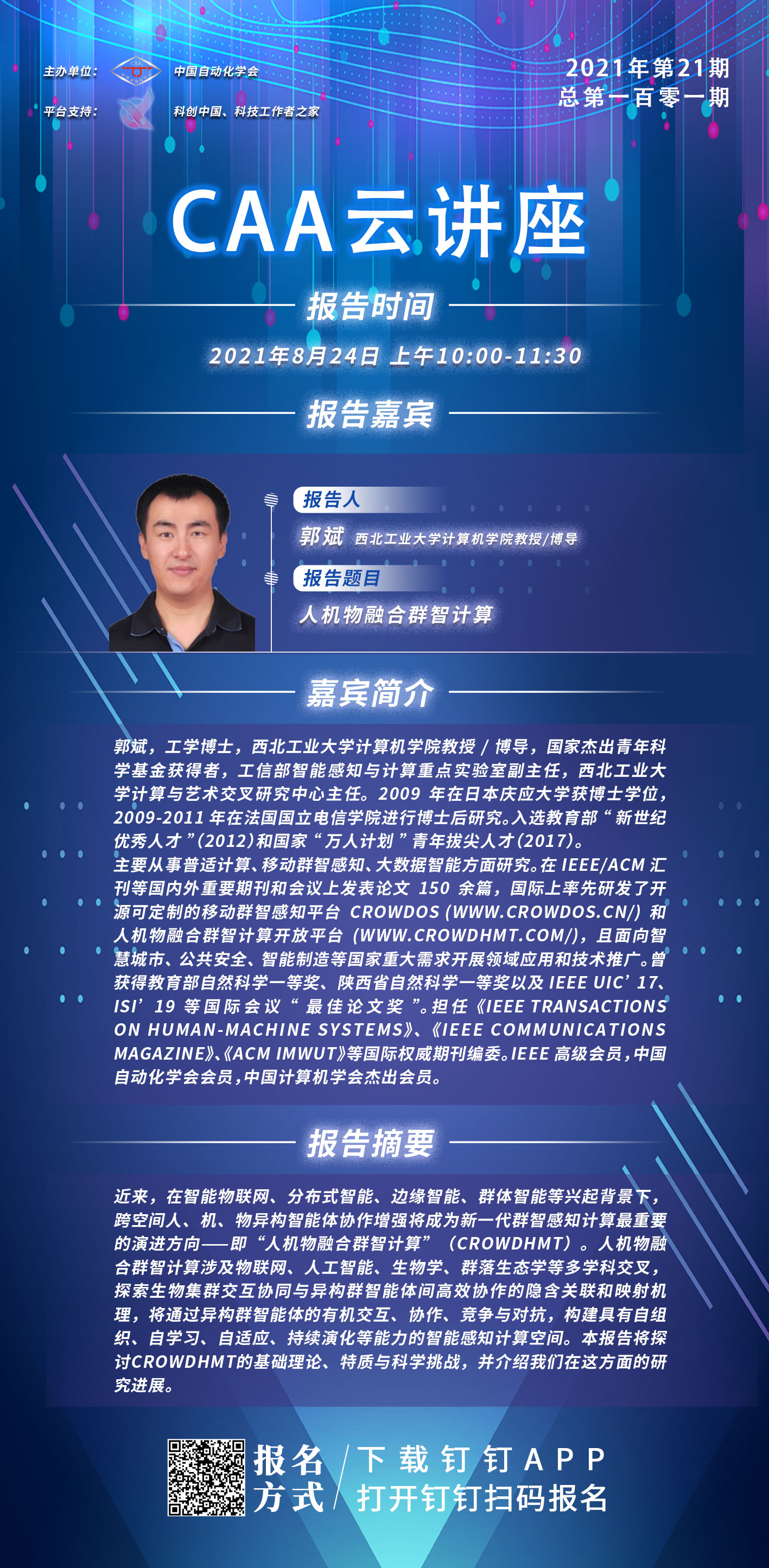 2021年中國自動化學(xué)會第二十一期云講座將于8月24日10:00-11:30開講,本期云講座邀請到西北工業(yè)大學(xué)郭斌教授,為大家?guī)韴?bào)告:人機(jī)物融合群智計(jì)算。精彩內(nèi)容,敬請期待!