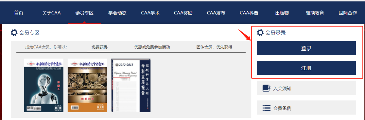 學(xué)會忠粉型:登錄學(xué)會官網(wǎng)caa.org.cn,點擊首頁“我要入會”,或在導(dǎo)航欄“會員專區(qū)”點擊“登錄”或“注冊”按鈕