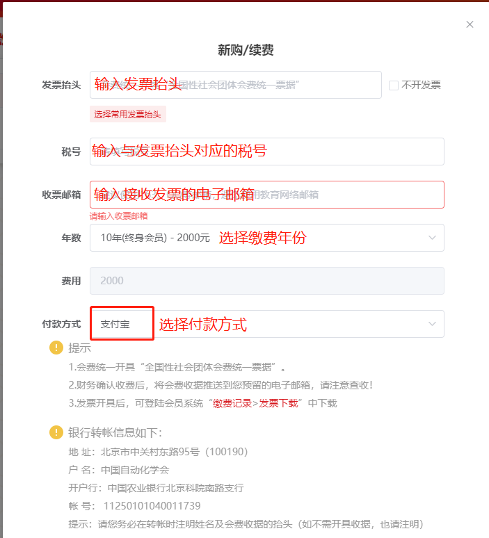 2. 依次填寫發(fā)票抬頭、稅號、接收發(fā)票的電子郵箱等信息,并完成繳費,如為銀行轉(zhuǎn)賬繳納會費需上傳銀行轉(zhuǎn)賬憑證后財務(wù)方可確認
