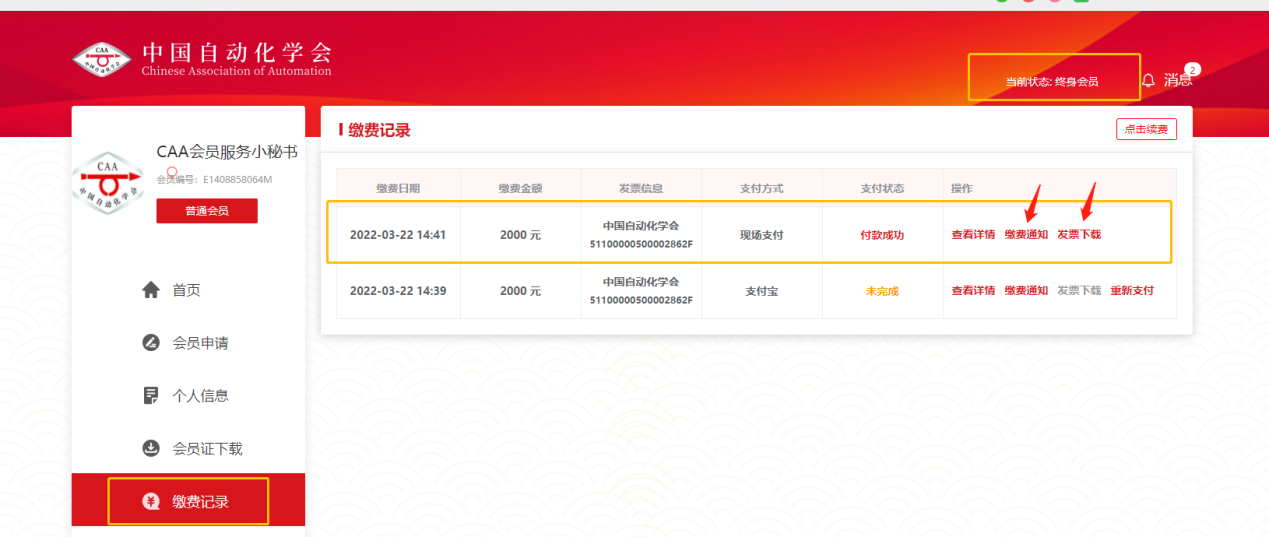 1. 會員繳費:點擊“繳費記錄”或頁面上方“點擊續(xù)費”按鈕,進入繳費界面