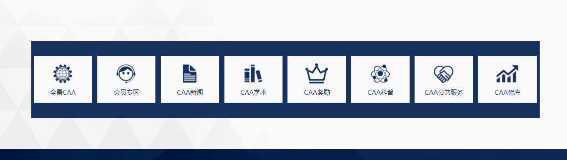 簡(jiǎn)潔明快的頁(yè)面,分為“首頁(yè)”、“關(guān)于CAA”、“會(huì)員專區(qū)”、“學(xué)會(huì)動(dòng)態(tài)”、“CAA學(xué)術(shù)”、“CAA獎(jiǎng)勵(lì)”、“CAA科普”、“出版物”、“繼續(xù)教育”以及“國(guó)際合作”等幾個(gè)部分。