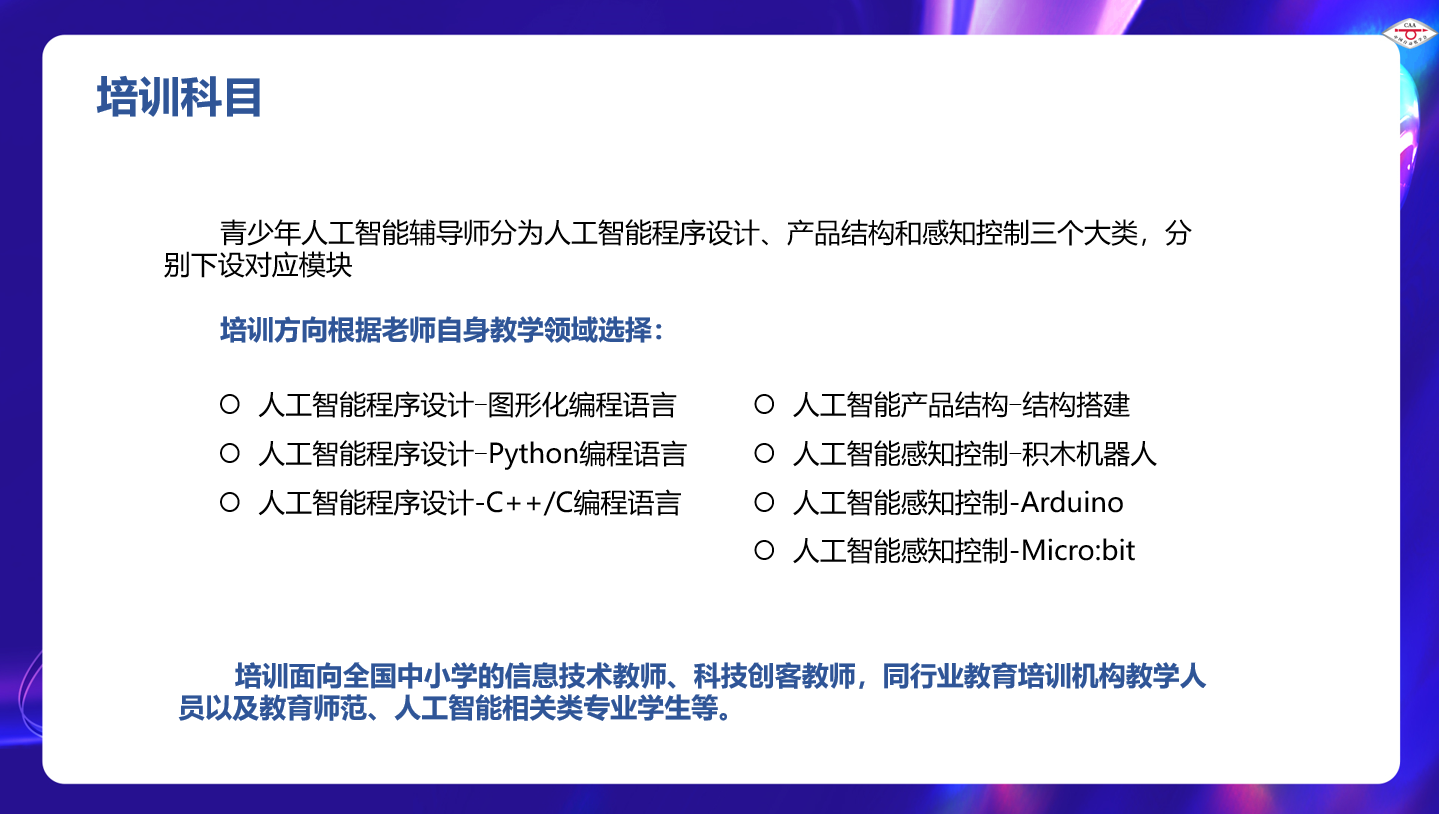 為貫徹落實國務(wù)院《新一代人工智能發(fā)展規(guī)劃》和《全民科學(xué)素質(zhì)行動規(guī)劃綱要(2021-2035年)》中的有關(guān)要求,推進人工智能教育的普及,助力人工智能時代所需的人才培養(yǎng),培養(yǎng)相關(guān)師資和裁判人才,中國自動化學(xué)會發(fā)起了青少年人工智能輔導(dǎo)師和青少年人工智能活動裁判員的培訓(xùn)工作。本期培訓(xùn)時間為2022年10月24日至11月5日,隨即在11月6日進行培訓(xùn)后的考核,報名參加課程培訓(xùn)并在考核中成績合格的學(xué)員,將獲得由中國自動化學(xué)會頒發(fā)的“青少年人工智能輔導(dǎo)師證書”或“青少年人工智能活動裁判員證書”。