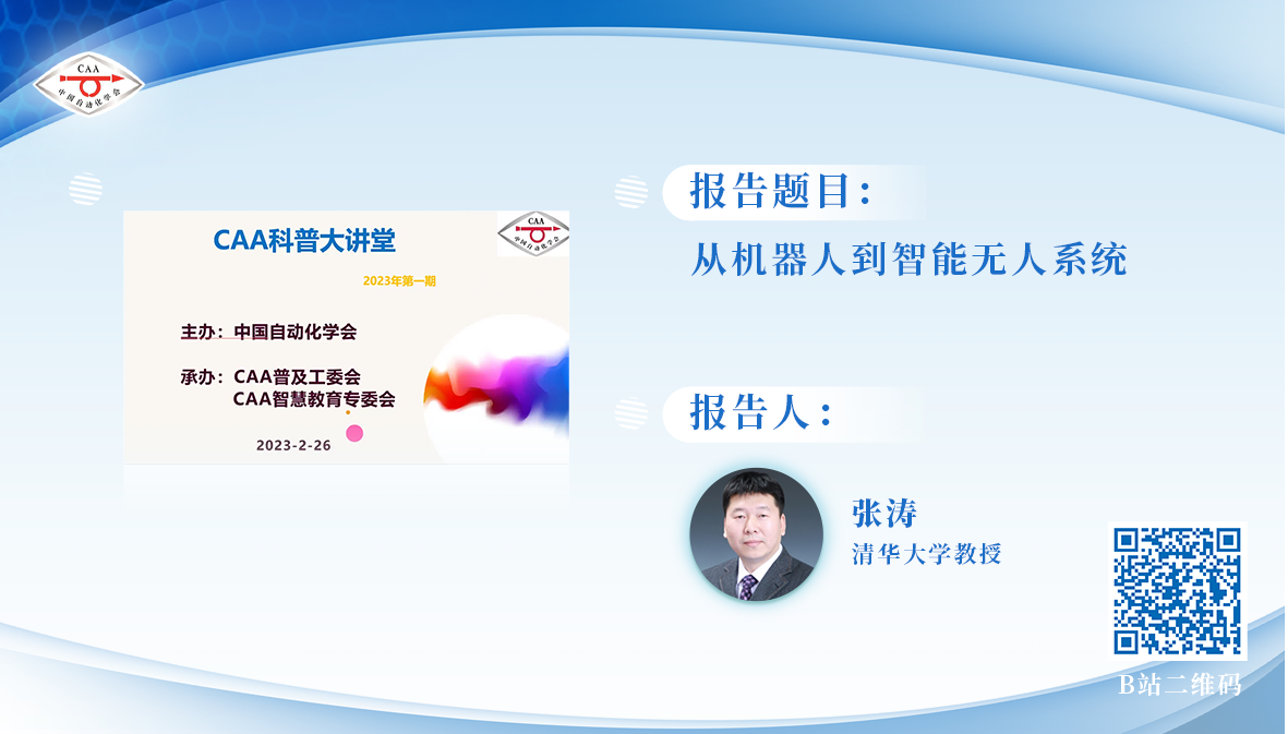 2023年首期CAA科普大講堂活動(dòng)于2023年2月26日成功召開。中國(guó)自動(dòng)化學(xué)會(huì)會(huì)士、理事,清華大學(xué)教授張濤作了題為“從機(jī)器人到智能無(wú)人系統(tǒng)”的報(bào)告。