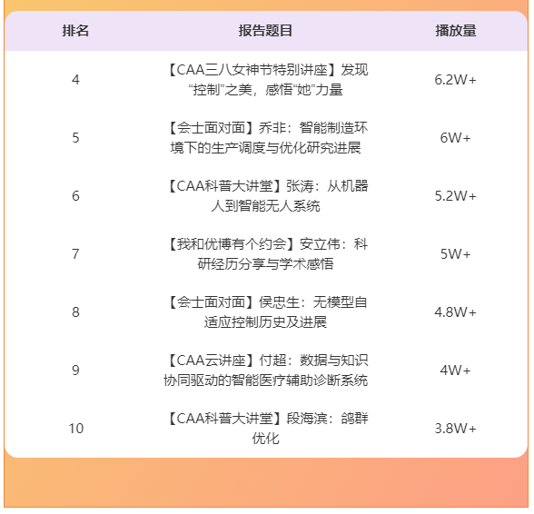 學(xué)術(shù)無邊界,探索無止境。2023年中國自動化學(xué)會線上線下聯(lián)動,繼續(xù)創(chuàng)辦多元化的CAA線上學(xué)術(shù)交流活動,加深學(xué)術(shù)交流。2023年第一季度學(xué)會共舉辦CAA云講座5期,會士面對面4期,CAA科普大講堂2期,CAA YeS論壇、我和優(yōu)博有個約會各1期,邀請了20余位專家學(xué)者在線分享前沿學(xué)術(shù)熱點(diǎn)、最新研究成果、行業(yè)應(yīng)用、學(xué)術(shù)經(jīng)驗(yàn)等內(nèi)容,不僅得到了廣大科技工作者的廣泛關(guān)注與熱情討論,各類線上會議的觀看數(shù)量也再次刷新歷史記錄,累計(jì)超過70萬人次觀看。