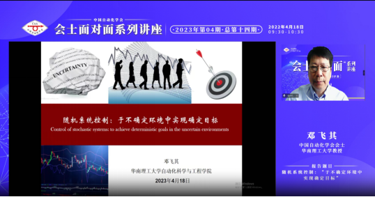 2023年第四期(總第十四期)會士面對面講座于2023年4月18日上午成功召開,中國自動化學會會士、華南理工大學鄧飛其教授,將帶來題為“隨機系統(tǒng)控制:于不確定環(huán)境中實現(xiàn)確定目標”的報告。