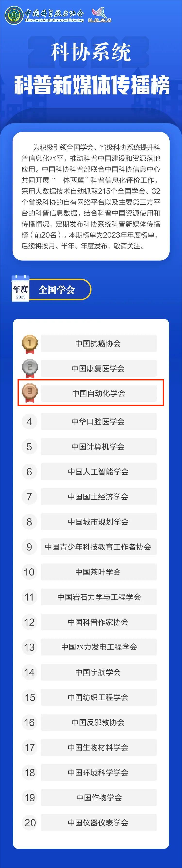 中國(guó)自動(dòng)化學(xué)會(huì)位列第三!
