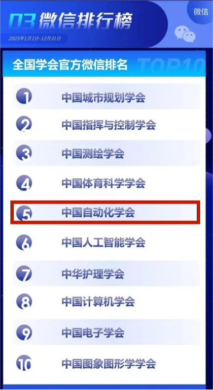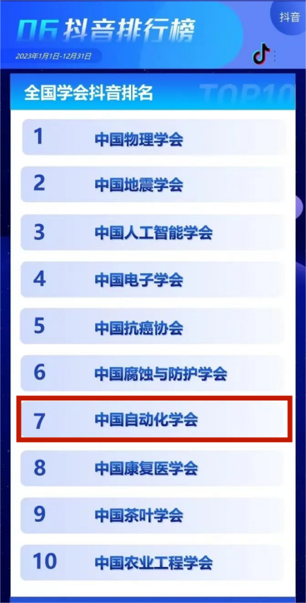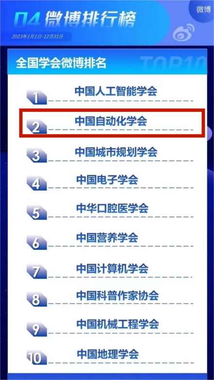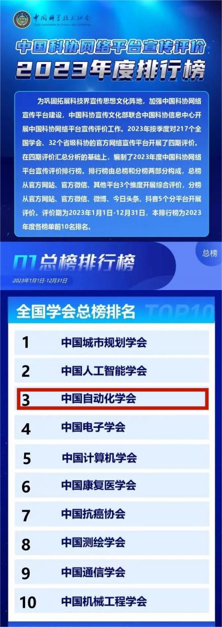 中國(guó)自動(dòng)化學(xué)會(huì)在總排行榜中位列第3,在各大分榜中,學(xué)會(huì)官方網(wǎng)站排名第9,微信公眾號(hào)排名第5,微博和今日頭條排名第2,抖音排名第7。