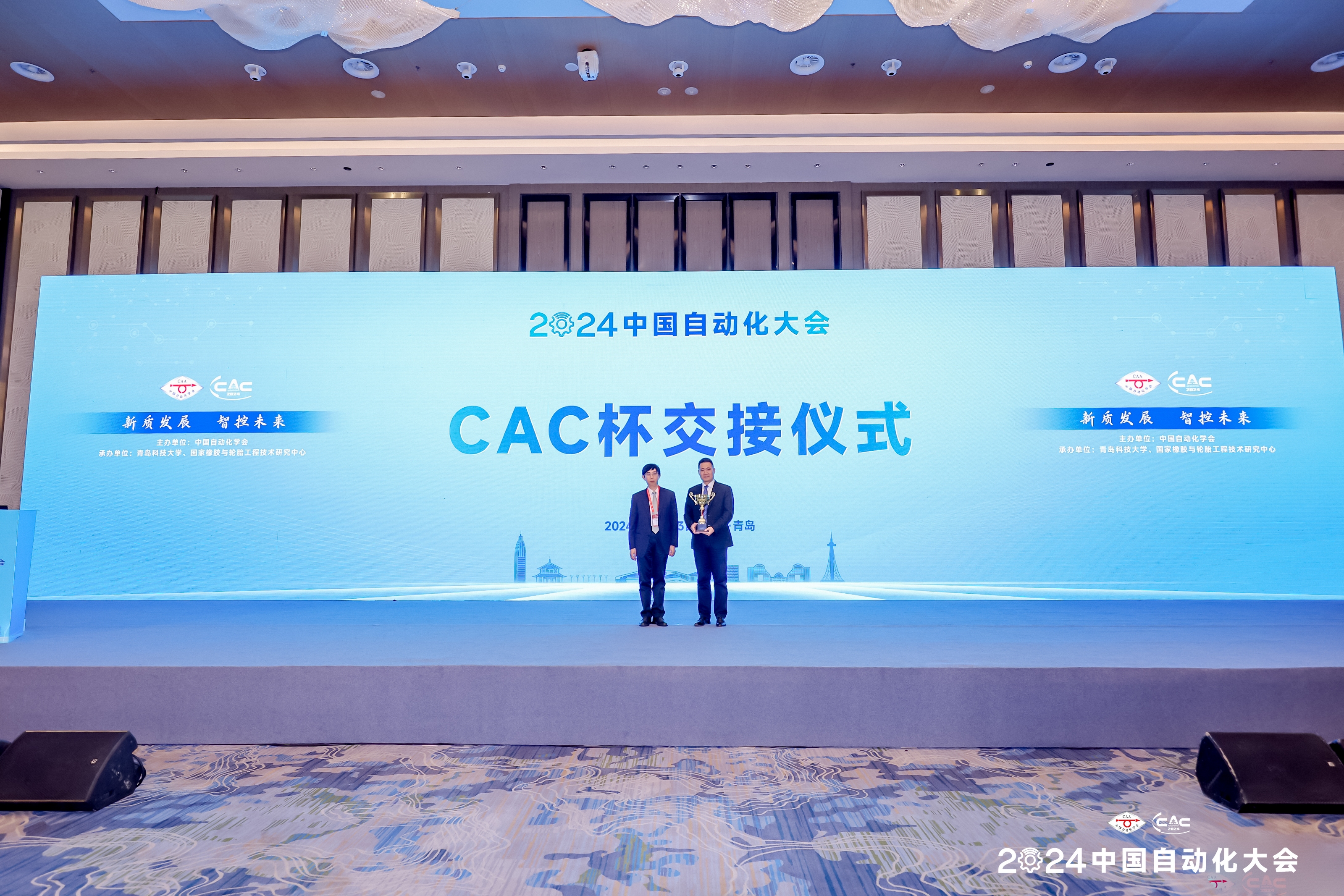 大會(huì)同期進(jìn)行了“CAC杯”交接儀式,2024中國自動(dòng)化大會(huì)組委會(huì)代表——青島科技大學(xué)副校長李少遠(yuǎn),將沉甸甸的“CAC杯”鄭重轉(zhuǎn)交給2025中國自動(dòng)化大會(huì)承辦單位代表——哈爾濱工程大學(xué)智能科學(xué)與工程學(xué)院院長蔡成濤。2025中國自動(dòng)化大會(huì)將于2025年11月在哈爾濱召開,續(xù)寫自動(dòng)化大會(huì)新篇章。