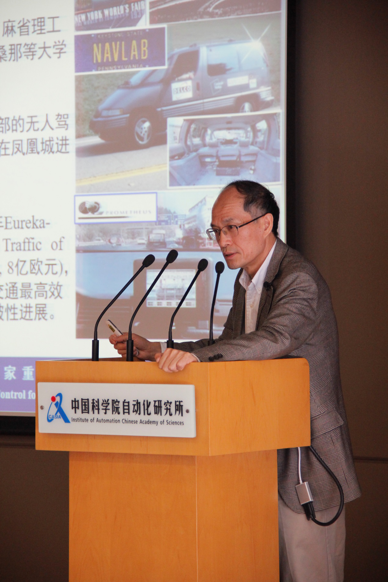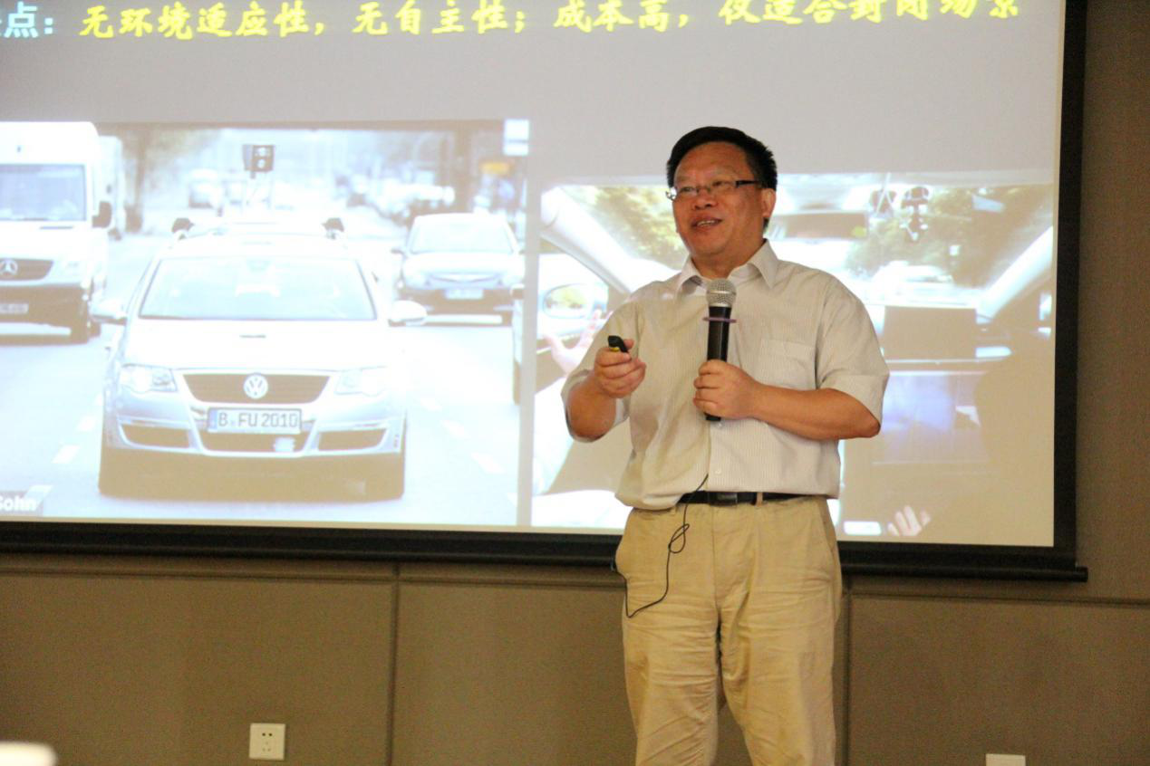 第一個(gè)進(jìn)行報(bào)告的是中國(guó)自動(dòng)化學(xué)會(huì)副理事長(zhǎng)兼秘書(shū)長(zhǎng),中國(guó)科學(xué)院自動(dòng)化研究所王飛躍教授,其報(bào)告題目為“無(wú)人車(chē)與智能駕駛:回顧與展望”。報(bào)告從智能汽車(chē)的興起談起,介紹了國(guó)內(nèi)外專(zhuān)家學(xué)者為智能汽車(chē)發(fā)展做出的各項(xiàng)努力。此后,王飛躍教授簡(jiǎn)要介紹了智能車(chē)未來(lái)挑戰(zhàn)賽和中國(guó)基金委“視聽(tīng)覺(jué)認(rèn)知”重大計(jì)劃,中國(guó)智能車(chē)綜合技術(shù)研發(fā)與測(cè)試中心。王飛躍教授也在報(bào)告中提出從平行汽車(chē)到平行交通是面向智能網(wǎng)聯(lián)發(fā)展的趨勢(shì)和必然,并提出了平行駕駛的發(fā)展規(guī)劃與展望。在交流環(huán)節(jié)中,面對(duì)大家提出的種種疑問(wèn),王教授進(jìn)行了精彩風(fēng)趣的解答。