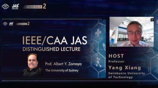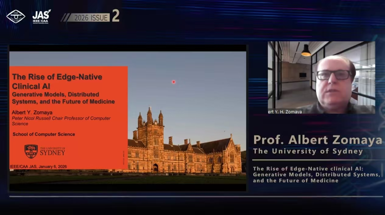 2026年1月6日14:00(北京時間),中國自動化學會(CAA)與 IEEE/CAA Journal of Automatica Sinica(JAS)聯(lián)合主辦的2026年第1期(總第2期) JAS 杰出講座(IEEE/CAA JAS Distinguished Lecture)成功舉辦。澳大利亞悉尼大學Albert Y. Zomaya教授以“邊緣原生臨床人工智能的崛起:生成式模型、分布式系統(tǒng)與醫(yī)療未來”(The Rise of Edge-Native Clinical AI: Generative Models, Distributed Systems, and the Future of Medicine)為題進行主旨演講。本次講座通過學會視頻號、B站、知乎、抖音以及新華社、網易科技等平臺面向全球同步直播,吸引了近40萬名海內外專業(yè)學者、科研人員及高校學生線上參與。