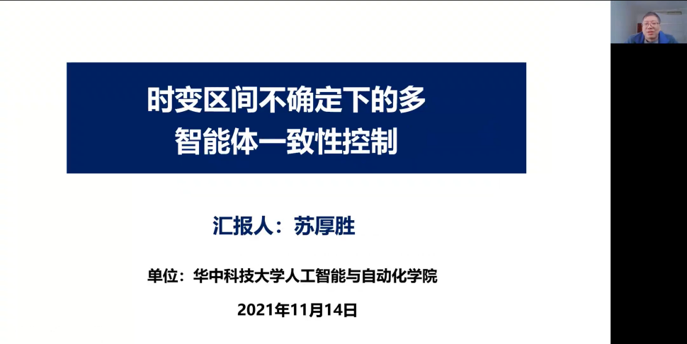 第五位報告人為來自華中科技大學(xué)的蘇厚勝教授,報告題目為“時變區(qū)間不確定下的多智能體一致性控制”。報告中通過對輸出反饋方法的描述,以正系統(tǒng)理論為主要依據(jù),討論了具有時變區(qū)間不確定性和初始狀態(tài)未知的連續(xù)時間不確定多智能體系統(tǒng)的一致性問題。