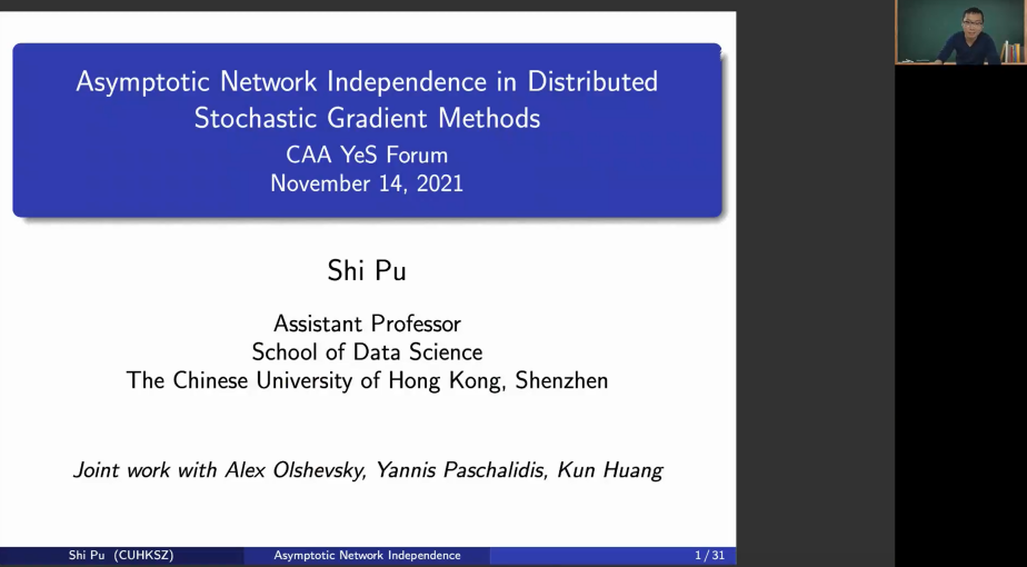 第八位報告人為香港中文大學(xué)(深圳)的濮實助理教授,報告題目為“Asymptotic network independence in distributed stochastic gradient methods”。報告對分布式隨機(jī)梯度下降算法與集中式梯度下降算法的性能進(jìn)行了比較,并討論了分布式隨機(jī)梯度算法實現(xiàn)網(wǎng)絡(luò)化收斂速度的瞬態(tài)時間。