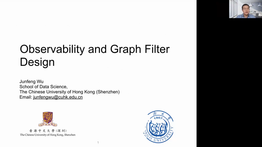 第十位報告人為來自香港中文大學(xué)(深圳)的吳均峰副教授,報告題目為“Observability and graph filter design”。報告中研究了有限脈沖響應(yīng)(FIR)圖濾波器的完全分布設(shè)計問題,通過向節(jié)點引入可觀察圖頻率的概念證明了節(jié)點的輸出信號(觀察信號)僅包含其所謂可觀察圖頻率的頻譜成分,并從控制理論的角度揭示了節(jié)點對地磁光譜分量的可觀測性與其可觀測矩陣的秩相關(guān)。