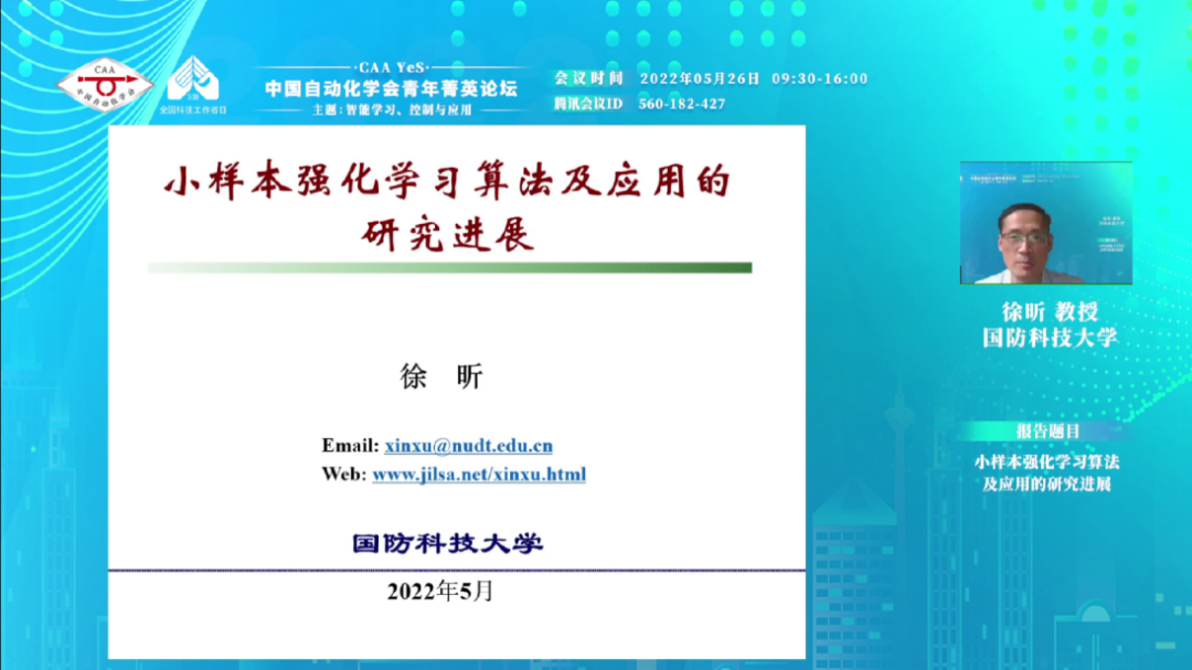 第二位報(bào)告人是來自國防科技大學(xué)的徐昕教授,報(bào)告題目為“小樣本強(qiáng)化學(xué)習(xí)算法及應(yīng)用的研究進(jìn)展”。徐教授對當(dāng)前強(qiáng)化學(xué)習(xí)求解大規(guī)??臻g優(yōu)化決策與控制問題中面臨的挑戰(zhàn)性問題特別是小樣本強(qiáng)化學(xué)習(xí)問題進(jìn)行了分析,重點(diǎn)介紹了小樣本強(qiáng)化學(xué)習(xí)在正則化特征表示、基于模型預(yù)測的算法設(shè)計(jì)、知識遷移機(jī)制等方面的研究進(jìn)展,并結(jié)合自動駕駛等領(lǐng)域的實(shí)際問題進(jìn)行了討論。最后,對未來的研究方向進(jìn)行了展望。