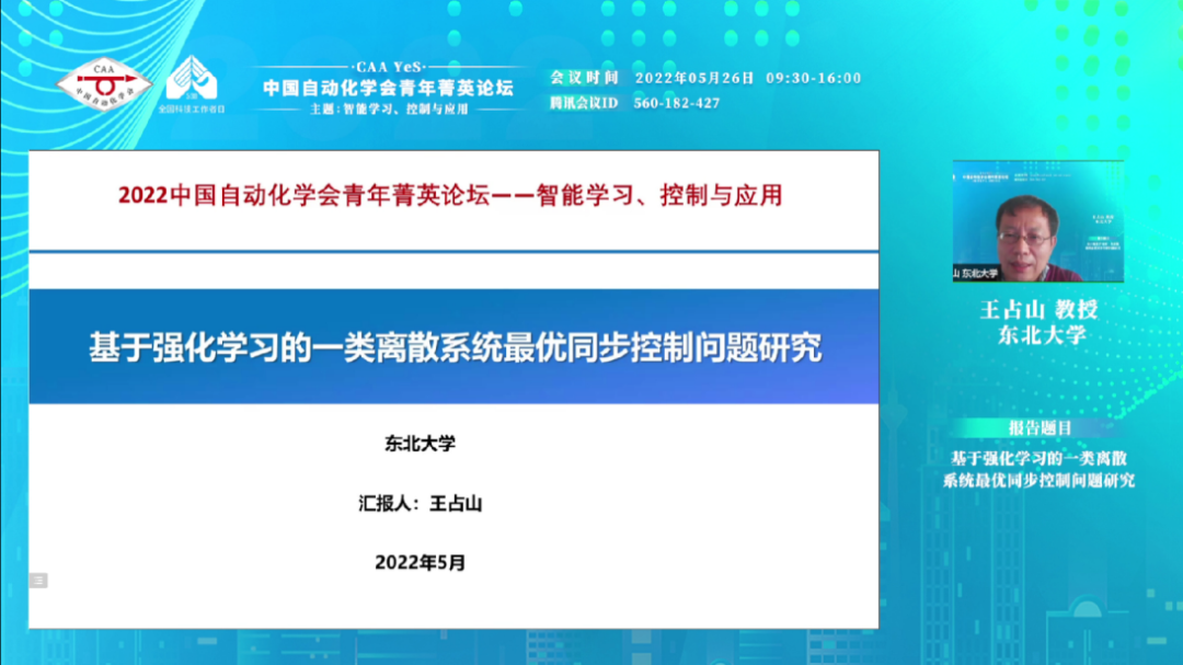 第五位報(bào)告人是來自東北大學(xué)的王占山教授,報(bào)告題目為“基于強(qiáng)化學(xué)習(xí)的一類離散系統(tǒng)最優(yōu)同步控制問題研究”。王教授首先針對控制理論中經(jīng)典的穩(wěn)定性、同步性、一致性等問題進(jìn)行了梳理,揭示了三者之間的相對穩(wěn)定性本質(zhì),由此將系統(tǒng)參數(shù)辨識、狀態(tài)估計(jì)、跟蹤、同步、調(diào)節(jié)等基本問題統(tǒng)一在一個(gè)架構(gòu)內(nèi),進(jìn)而介紹了基于強(qiáng)化學(xué)習(xí)的一類離散系統(tǒng)最優(yōu)同步控制問題,并探討了自動化與智能自動化之間的關(guān)系以及控制作用的時(shí)間序列數(shù)據(jù)本質(zhì)。