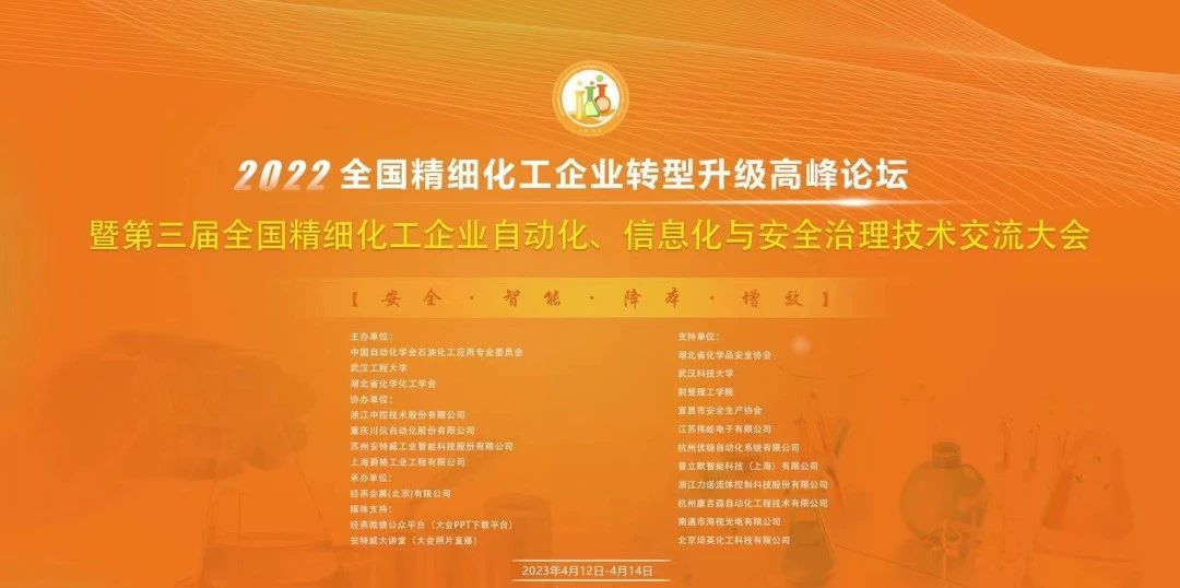 2023年4月12日-4月14日,“2022全國精細化工企業(yè)轉(zhuǎn)型升級高峰論壇暨第三屆全國精細化工企業(yè)自動化、信息化與安全治理技術(shù)交流大會”在武漢順利召開,會議由中國自動化學(xué)會石油化工應(yīng)用專業(yè)委員會、武漢工程大學(xué)、湖北省化學(xué)化工學(xué)會等單位聯(lián)合舉辦,浙江中控、重慶川儀、蘇州安特威、上海爵格共同協(xié)辦了此次大會,中國自動化學(xué)會石油化工應(yīng)用專業(yè)委員會秘書長張建立主持了開幕式。