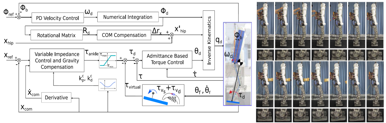 通過研究,我們發(fā)現(xiàn)虛擬模型控制方法在降低對(duì)精確模型依賴性方面取得了進(jìn)展。然而,在復(fù)雜環(huán)境下,虛擬模型控制的容錯(cuò)性存在限制。因此,我們進(jìn)行了相關(guān)研究,并借鑒人類保持平衡時(shí)的行為策略。與傳統(tǒng)方法不同,人類在受到擾動(dòng)時(shí)采用踮腳的方式來保持穩(wěn)定,從而縮小了穩(wěn)定域的范圍。我們?cè)?/span>理論上證明,只需保持在穩(wěn)定域邊界上即可實(shí)現(xiàn)穩(wěn)定性,而不需要較大的穩(wěn)定域和支撐域。進(jìn)一步,基于虛擬模型的思想,我們提出了一種通過足部?jī)A斜主動(dòng)控制來增加穩(wěn)定域的方法,如圖6所示。在人形機(jī)器人上成功實(shí)現(xiàn)了該方法,并發(fā)表了高水平的論文。然而,人形機(jī)器人在多個(gè)虛擬模型的結(jié)合和協(xié)調(diào)方面存在一定限制,以及在不同場(chǎng)景下設(shè)計(jì)不同虛擬模型的通用性的挑戰(zhàn)。