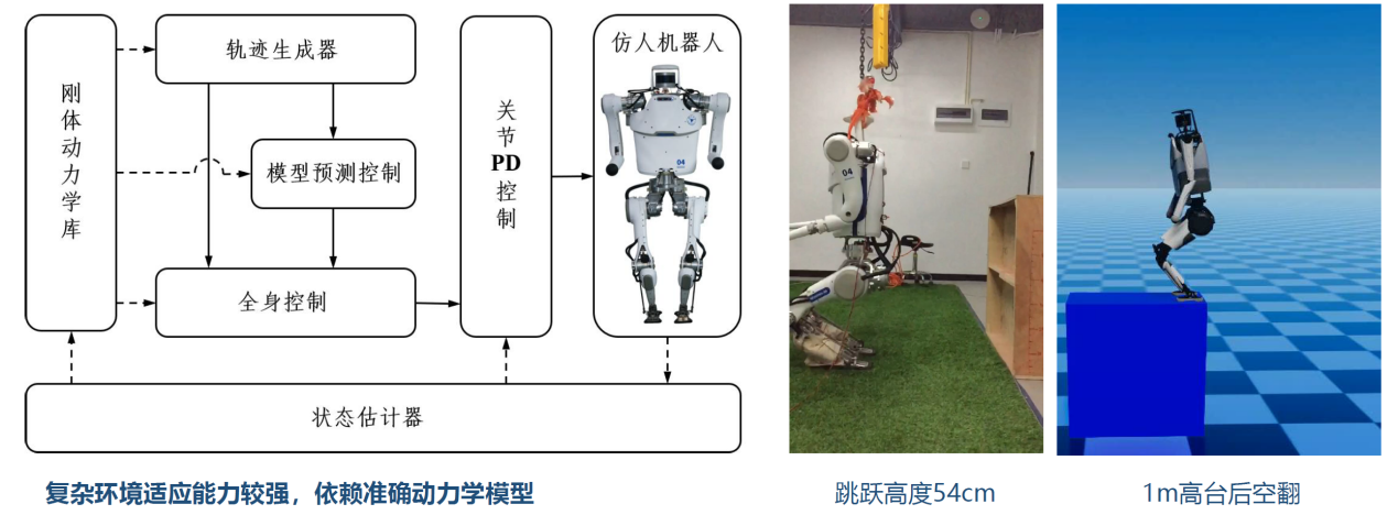 所以,采用模型預(yù)測(cè)控制和全身控制的方法可以提高人形機(jī)器人的動(dòng)作穩(wěn)定性和協(xié)調(diào)性,如圖7所示。這種方法基于軌跡規(guī)劃和剛體動(dòng)力學(xué)建模,通過模型預(yù)測(cè)控制計(jì)算地面反作用力和力矩,并結(jié)合全身控制生成關(guān)節(jié)力矩。通過該集成控制策略,我們能夠更準(zhǔn)確地預(yù)測(cè)和調(diào)整機(jī)器人的運(yùn)動(dòng),使其能夠在復(fù)雜環(huán)境中實(shí)現(xiàn)穩(wěn)定的運(yùn)動(dòng)和協(xié)調(diào)的動(dòng)作。在仿真環(huán)境中已經(jīng)實(shí)現(xiàn)了一些復(fù)雜動(dòng)作,如跳躍和后空翻,但仍需要進(jìn)一步提升關(guān)節(jié)力矩以實(shí)現(xiàn)更高水平的執(zhí)行能力。我們將繼續(xù)努力改進(jìn)和優(yōu)化控制方法,以進(jìn)一步提升人形機(jī)器人的運(yùn)動(dòng)能力和執(zhí)行復(fù)雜動(dòng)作的能力。