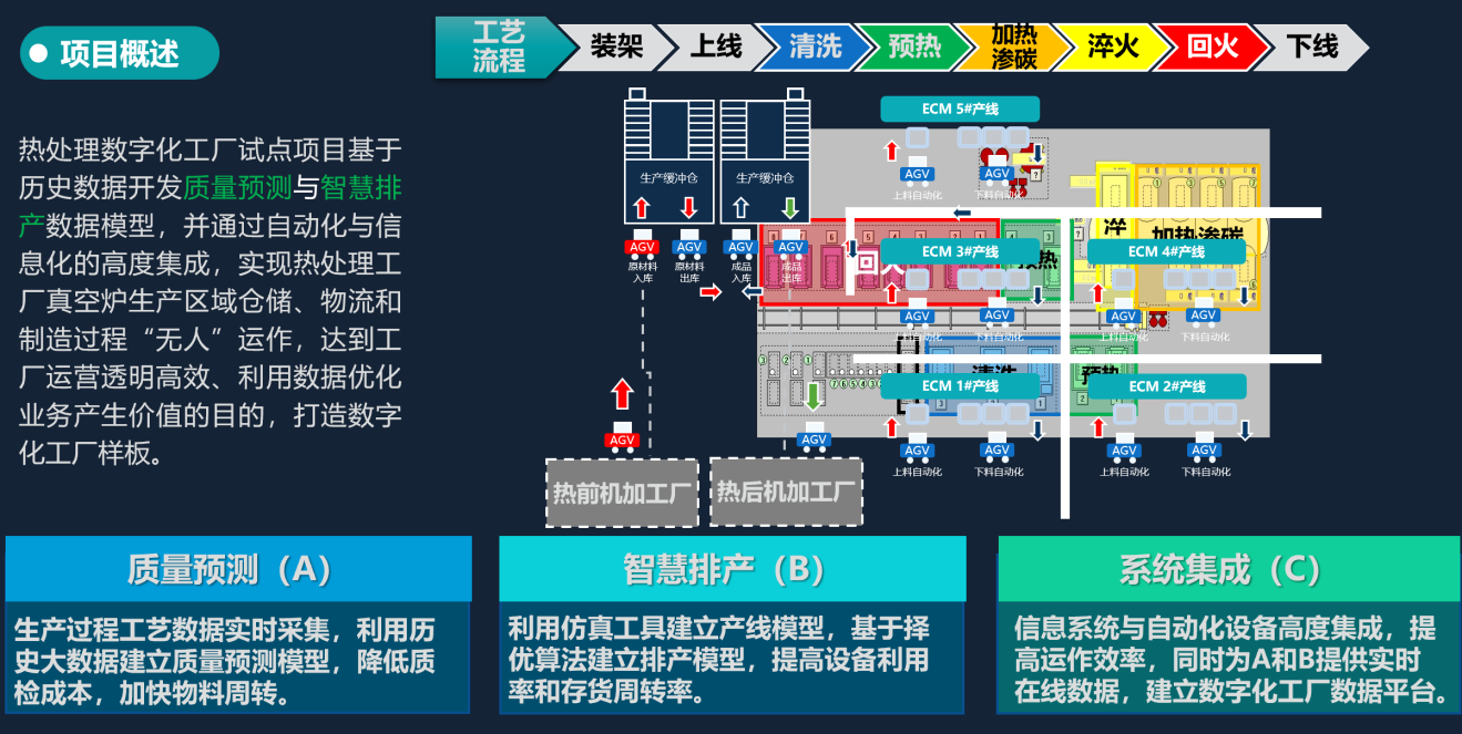 總的來說,該汽車零部件制造公司面臨著熱處理效率低下、高昂的質(zhì)檢成本和數(shù)據(jù)流程不透明等挑戰(zhàn)。然而,他們擁有五條真空產(chǎn)線、大量傳感器和海量數(shù)據(jù)存儲,同時在自動化設(shè)備普及率高的環(huán)境中,員工素質(zhì)和對數(shù)據(jù)的理解也相當(dāng)出色。在這個基礎(chǔ)上,公司提出了ABC三個解決方案來優(yōu)化工藝裝架、上線、清洗、預(yù)熱、加碳和淬火等流程,如圖6所示。利用歷史數(shù)據(jù)進(jìn)行質(zhì)量預(yù)測,智能排查問題,結(jié)合AGB技術(shù)實現(xiàn)了無人化工廠。