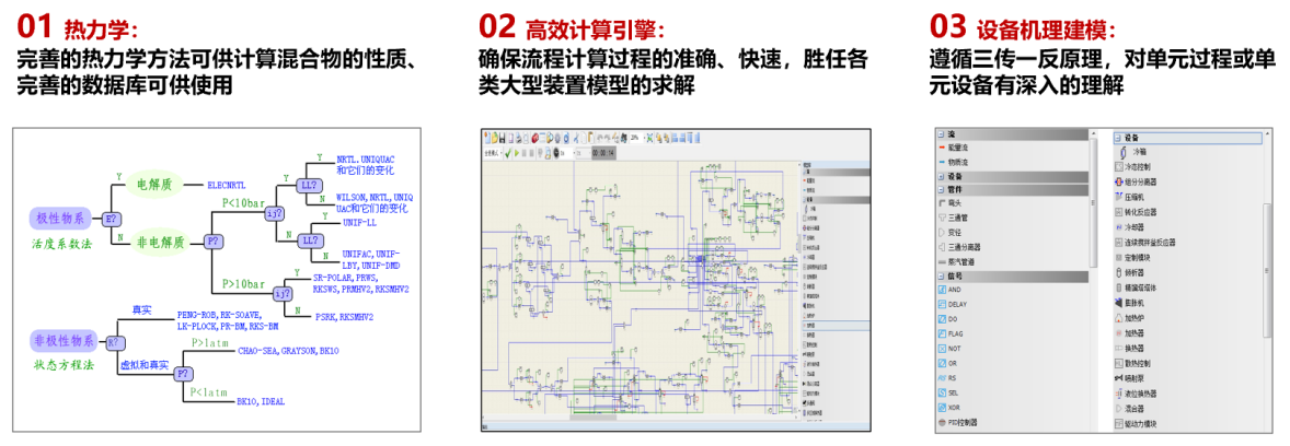 在流程模擬仿真領(lǐng)域,核心技術(shù)涵蓋熱力學(xué)、高效計(jì)算引擎和設(shè)備機(jī)理建模,如圖3所示。其中,設(shè)備機(jī)理建模對(duì)于深入理解研究對(duì)象至關(guān)重要。在仿真過程中,僅依賴數(shù)據(jù)會(huì)帶來不少問題,因此深入把握所描述對(duì)象的性質(zhì)至關(guān)重要,這有助于解決諸多關(guān)鍵性問題,符合仿真的實(shí)際目標(biāo)。中間的計(jì)算引擎也是以前國(guó)產(chǎn)軟件中遇到的一個(gè)挑戰(zhàn),因?yàn)樾枰咝幚碓S多高度非線性的對(duì)象。如何有效地使用求解器來處理這些非線性對(duì)象是一個(gè)重大難題。除了熱力學(xué)之外,這牽涉到很多流程模擬中的核心問題。