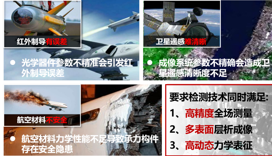 高精度檢測在樹脂復合材料重大裝備方面至關重要,主要涵蓋三個主要方面:第一,實現對樹脂復合材料的高精度全廠測量,確保其結構、尺寸、形狀等符合質量標準和設計規(guī)范;第二,實現多表面成像技術,以獲取復雜構件多個表面的細節(jié)和結構信息,便于全面分析評估;第三,具備高動態(tài)范圍的力學特性表征能力,特別是在極端環(huán)境下對材料性能進行準確測定,如圖1所示。樹脂復合材料被廣泛應用于航空航天等領域的承力構件,其高強度、耐高溫和低密度等優(yōu)點使其備受青睞,對它進行高精度檢測是確保其質量、安全性和可靠性的關鍵。