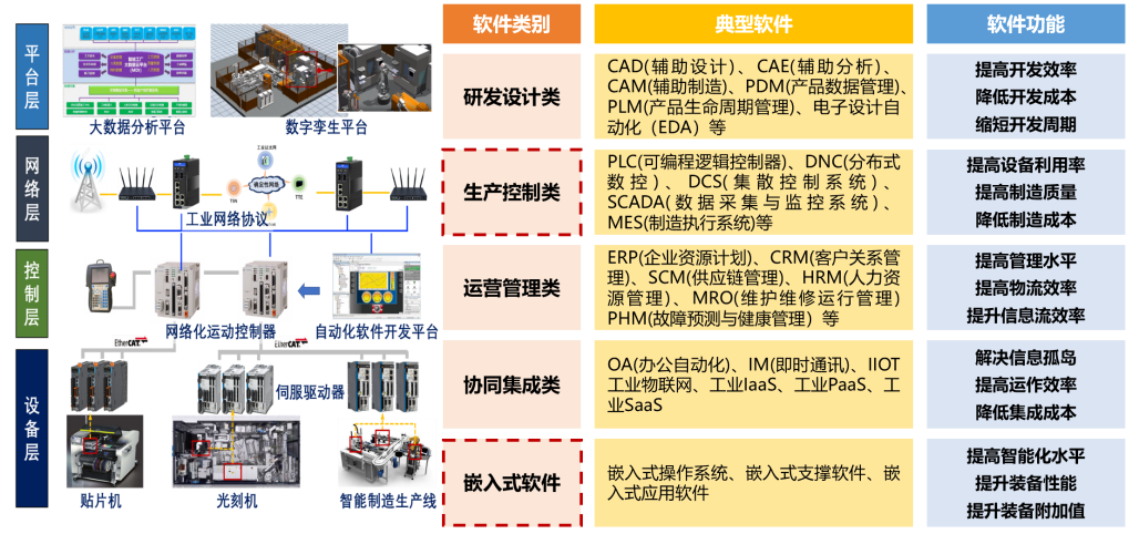 工業(yè)軟件具有多重定義,可根據(jù)其在技術(shù)層面上的定位分為五種類(lèi)別,如圖1所示。首先是面向底層的嵌入式軟件,這包括嵌入式操作系統(tǒng)及其相關(guān)平臺(tái)。其次是協(xié)同集成類(lèi)、研發(fā)設(shè)計(jì)類(lèi)、生產(chǎn)控制類(lèi)和運(yùn)營(yíng)管理類(lèi)軟件,這些類(lèi)型的軟件在不同階段和領(lǐng)域中扮演著重要角色。