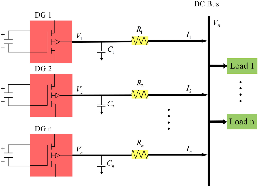 分布式直流微電網(wǎng)的應(yīng)用愈發(fā)普遍,典型結(jié)構(gòu)如圖7所示。由于下垂控制的應(yīng)用,電壓恢復(fù)和電流共享無(wú)法同時(shí)保證。我們針對(duì)二級(jí)控制層提出了一種新的自適應(yīng)安全控制策略,并采用事件觸發(fā)機(jī)制來(lái)減輕通信負(fù)擔(dān)。在消除總線電壓偏差的同時(shí),保證了分布式發(fā)電單元的電流共享。即使在能量受限型DoS攻擊下,控制目標(biāo)也可以很好地實(shí)現(xiàn)。此外,控制器和驅(qū)動(dòng)機(jī)制的設(shè)計(jì)無(wú)需總線電壓采樣和任何全局信息。